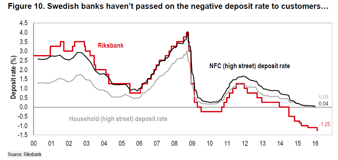 Podívejme se na jeden zvláště zajímavý případ, což je negativní úrok. Grafy k euru najdete v článku Studená válka a ruský rubl, kde vidíte zápornou hodnotu německých státních dluhopisů. Podívejte se na jednu normální skandinávskou banku, abyste viděli, co nám banksteři udělali z peněz za posledních 15 let. |